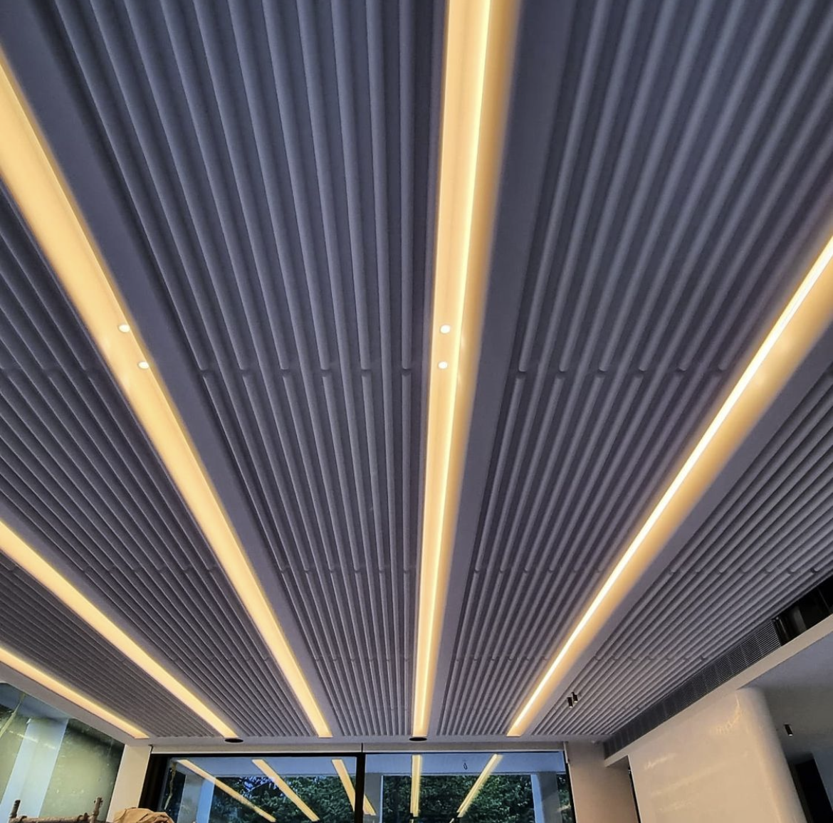 This is a custom project that consists of a two-piece light trough moulding and a 166 plaster battens. Having them surrounded by spectacular custom glass doors and skylights, makes the ceiling seem like it’s floating in all its glory.